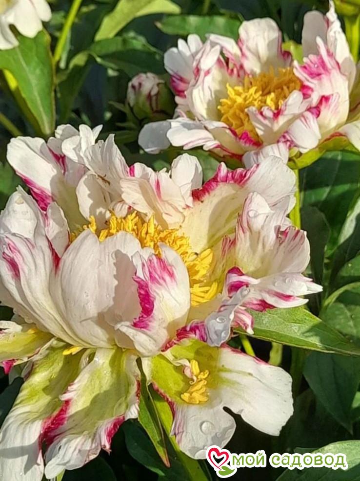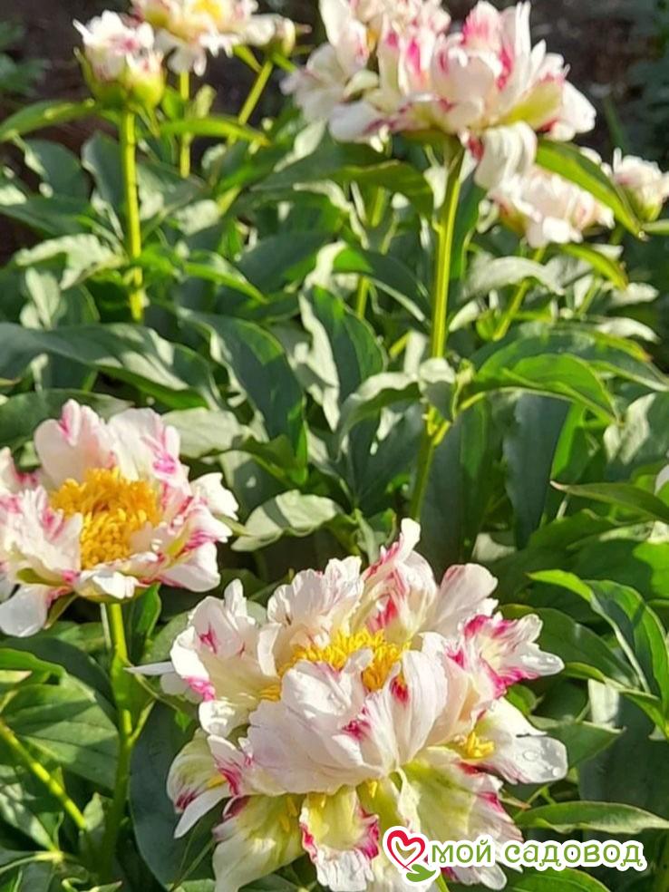 Пион Твиттерпэйтэд — Цветок диаметром 10-15 см, нежно-розовый или кремовый с вишневыми или малиново-красными нерегулярными полосами и штрихами. В центре золотисто-жёлтые тычинки. Листва светло-зелёная. Стебли с двумя бутонами. Высота 80-90 см. Срок цветения ранний. Место посадки Для посадки пионов понадобится защищенное от ветров место с хорошей освещенностью. Сорта светлой окраски, а также пионы с простыми и полумахровыми цветками можно посадить на частично затеняемом участке, это продлит цветение и защитит цветы от выгорания. Почва для посадки Залог успешного цветения пиона в будущем — это подготовка почвы! 1. Подготовка ямы — 70*70 см на скудных песчанистых и торфянистых почвах — 50*50 см на плодородных, окультуренных почвах. ХРАНЕНИЕ ДО ПОСАДКИ: После получения посылки, рекомендуем вскрыть пакет и осмотреть корневище. Почки должны быть плотные и розового цвета. Так же уделите внимание самому корневищу, все сомнительные, потемневшие, сморщенные части удалите, а места среза обработайте зеленкой или залой. Если почки еще не тронулись в рост, а высаживать в открытый почву рано, советуем Вам хранить корневище в холодильнике, обязательно оставляя его в пакете с торфяной смесью или в коробке под снегом. Если почки успели раскрыться это не критично, сохранить до посадки их так же возможно, высадите корень пиона в большой просторный горшок или в любую другую ёмкость.